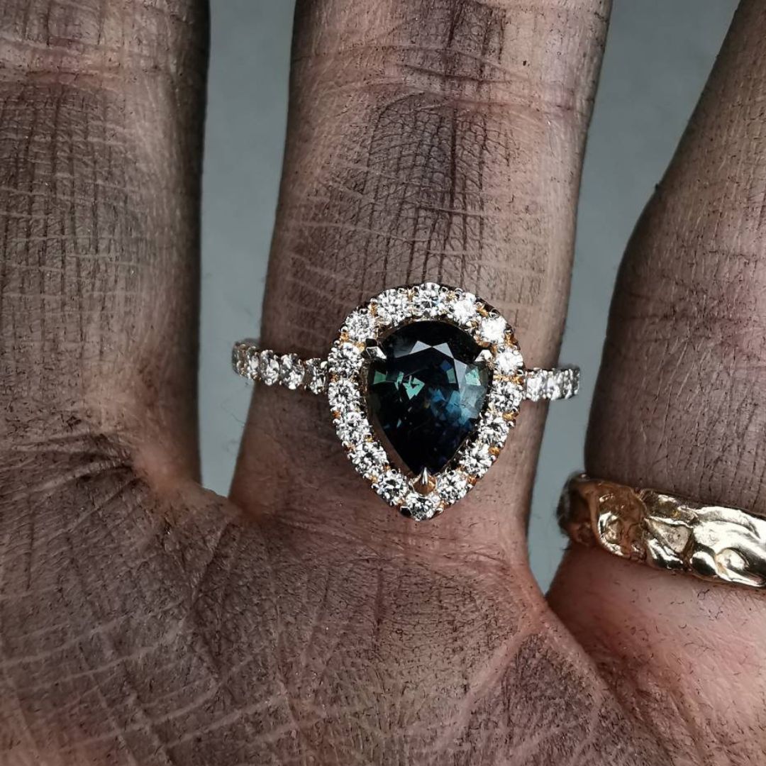 Raudono aukso žiedas su 5x7 mm safyru, 1.7mm ir 1.5 mm lab. deimantais.