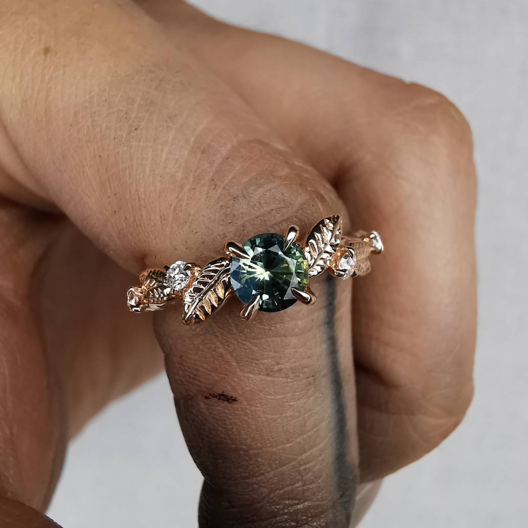 ○ 14k raudono aukso žiedas su safyru ir deimantais