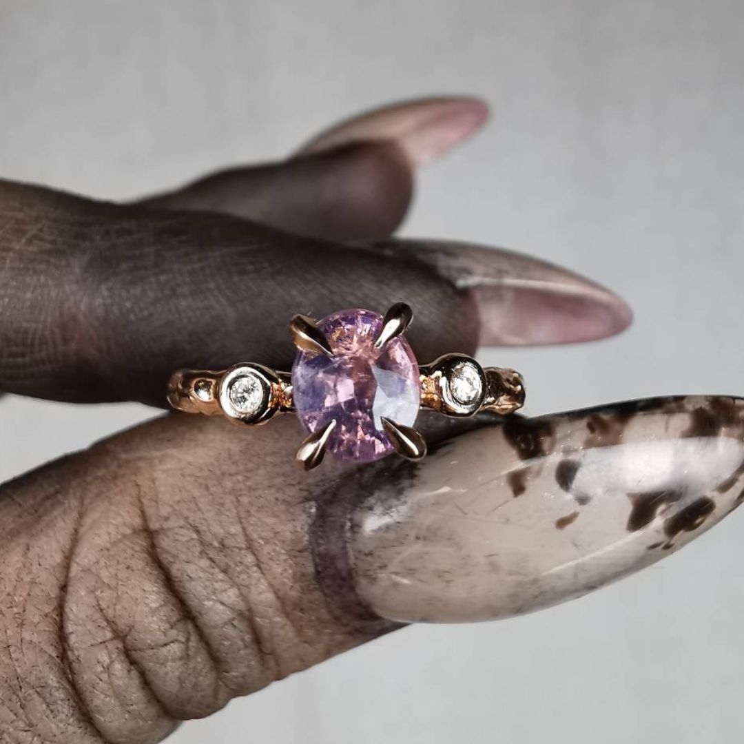 Autorinis raudono aukso žiedas su špineliu ir 1,45 mm natūraliais deimantais.
