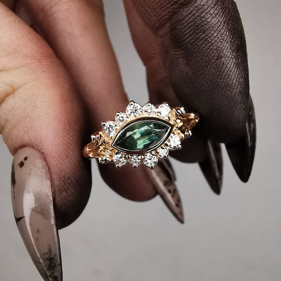 14k raudono aukso žiedai su safyru ir lab. deimantais