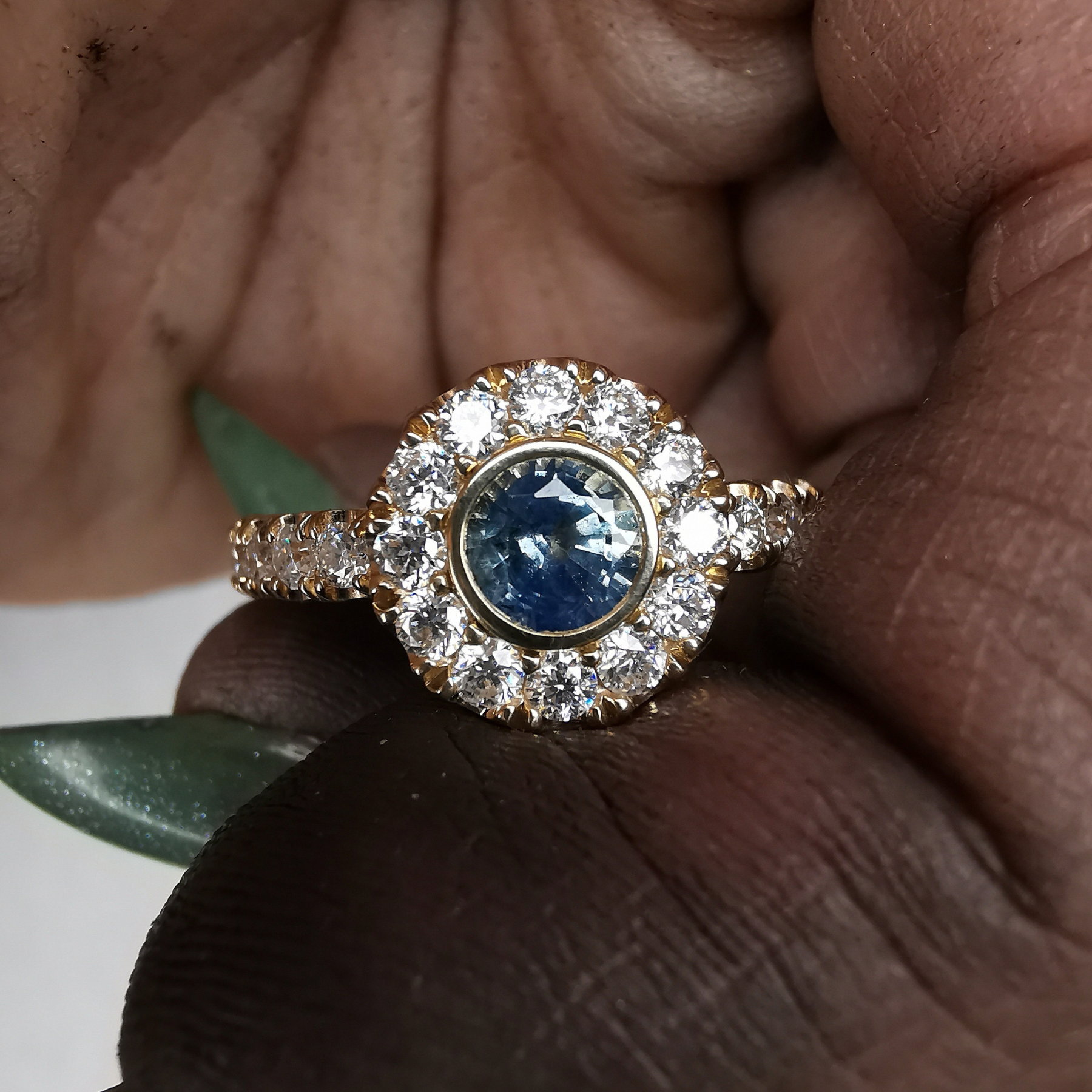 Geltono aukso žiedas su 5 mm safyru, 2mm lab. moisanitais aplink.