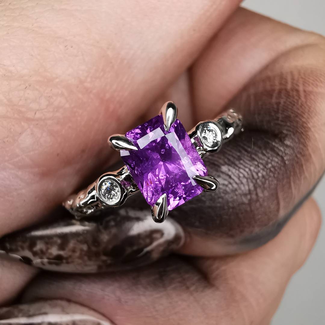 14k Balto aukso autorinis žiedas su safyru ir naturaliais deimantais