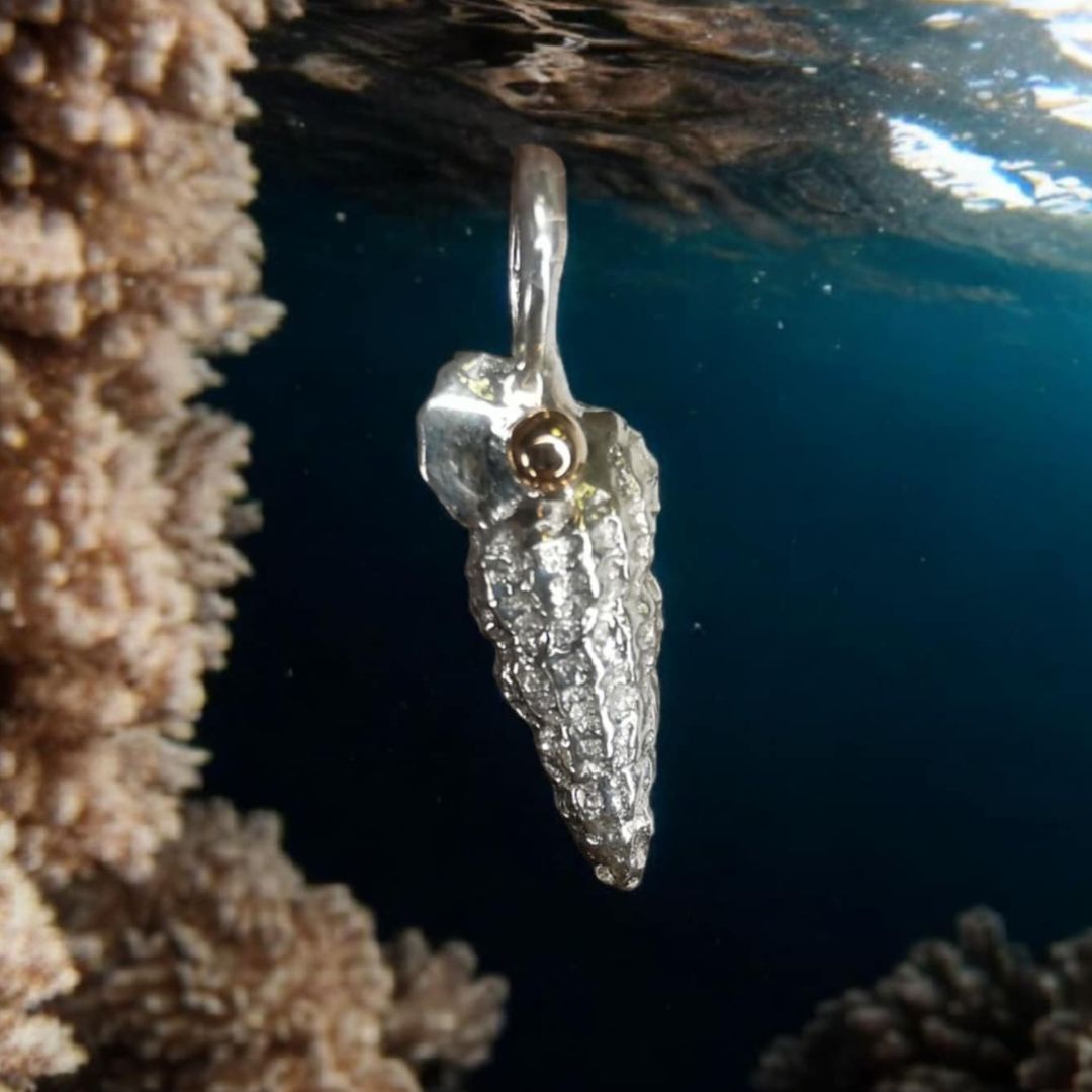 Silver shell pendant with rose gold drop.